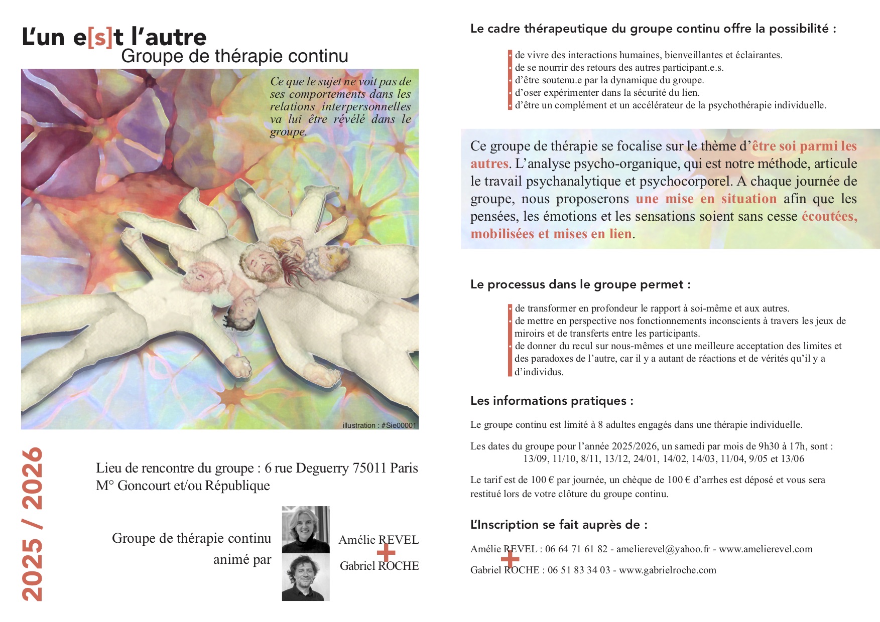 Je co-anime un groupe de thérapie intitulé L’Un e[s]t l’Autre. Nous avons eu l’immense joie de le créer en 2023. Il se poursuit avec un beau noyau. Il reste de la place pour de nouveaux patients dès le mois de septembre 2025.